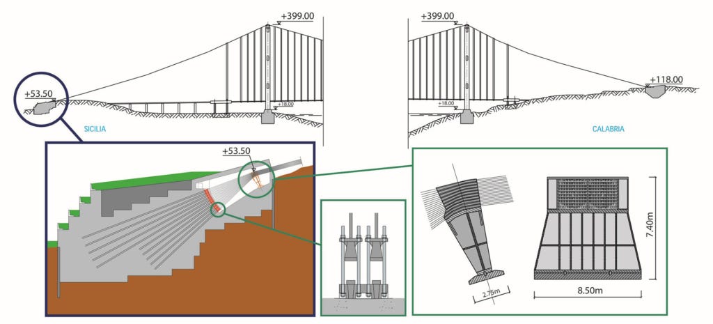 The Straight of Messina bridge is back under way. Should the project be completed, it will become the longest suspension bridge in the world at 3.3 km, smashing the previous record of 2.0 km in Turkey.