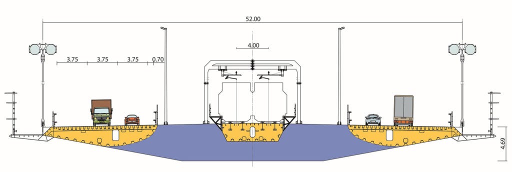 The greatest problem in designing the bridge is the aerodynamic stability of the deck under wind as well as seismic activity. A three-part box girder section was designed for the deck with the middle box carrying two railroad tracks and the outer boxes carrying the vehicular traffic. The three sections are connected by diaphragms at regular intervals corresponding to the position of the hangers. The latter connect to a pair of main cables on each side of the deck.