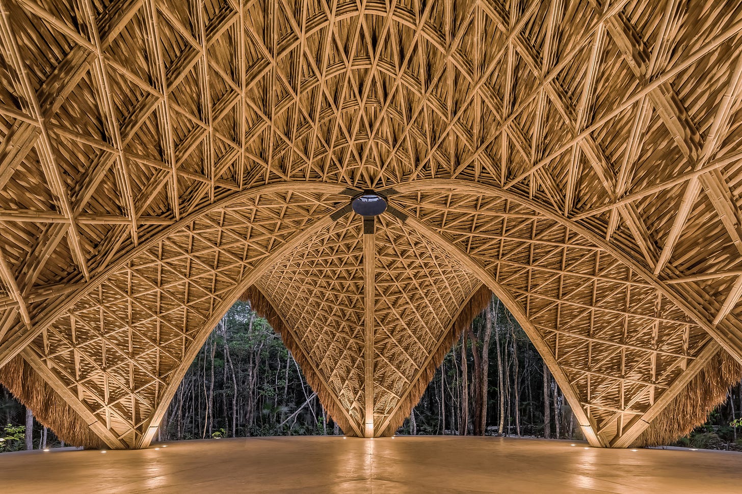 The interconnected roof diaphragm is made of cross-layers of bamboo mats —a modern nod to empirical techniques of the past that give the structure impressive resistance to lateral loads. To account for bamboo's natural flex and movement, the structure incorporates articulated foundations and a central compression ring. This approach not only captures bamboo's intrinsic strengths but also circumvents its limitations, demonstrating a model way to build sustainably and innovatively.