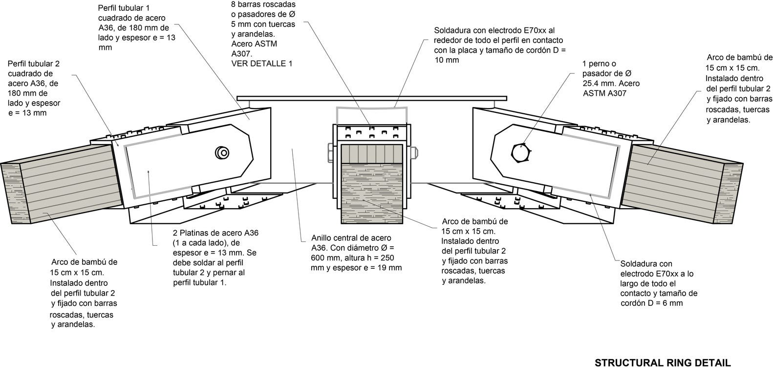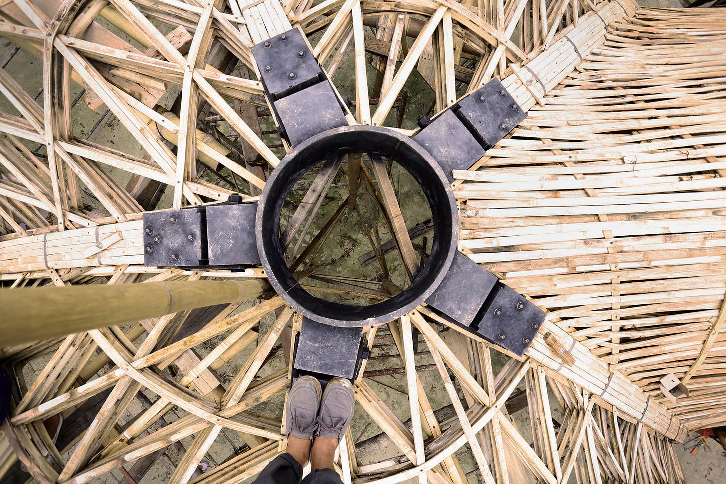 At the uppermost part of the structure, the primary arches converge, interconnected by a central steel compression ring. This design feature ensures each arch tip converges towards a centralized point, reminiscent of a star's radiating arms. Drawing a parallel to airplane wings, which flex and bounce to a certain extent during flight to prevent structural failure, bamboo structures adopt a similar engineering principle. To ensure the bamboo components can flex and adapt during adverse events like storms or earthquakes without fracturing, the central compression ring incorporates robust hinged connections.